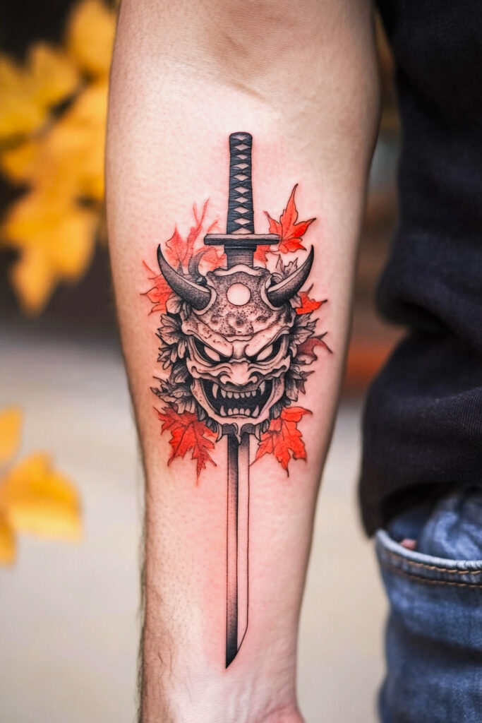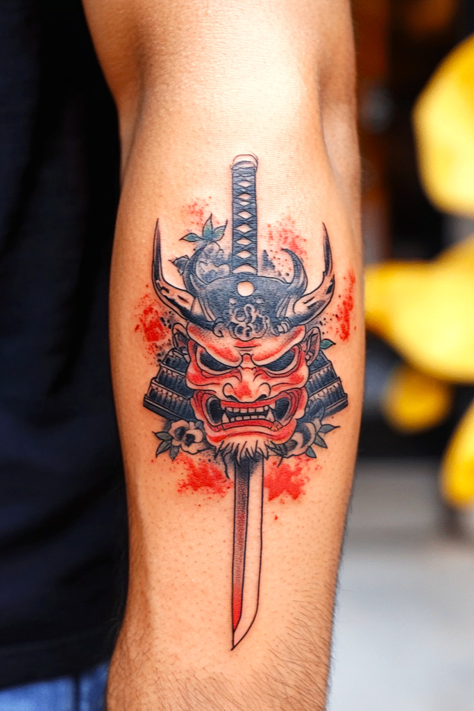 Blending the fearsome Oni Mask Tattoo with Samurai motifs creates a striking representation of warrior spirit and inner strength. These tattoos often include samurai swords, armor, or battle scenes alongside the mask, signifying the eternal battle between good and evil. This design is ideal for anyone who admires the Bushido code or wishes to express honor, bravery, and perseverance through ink.