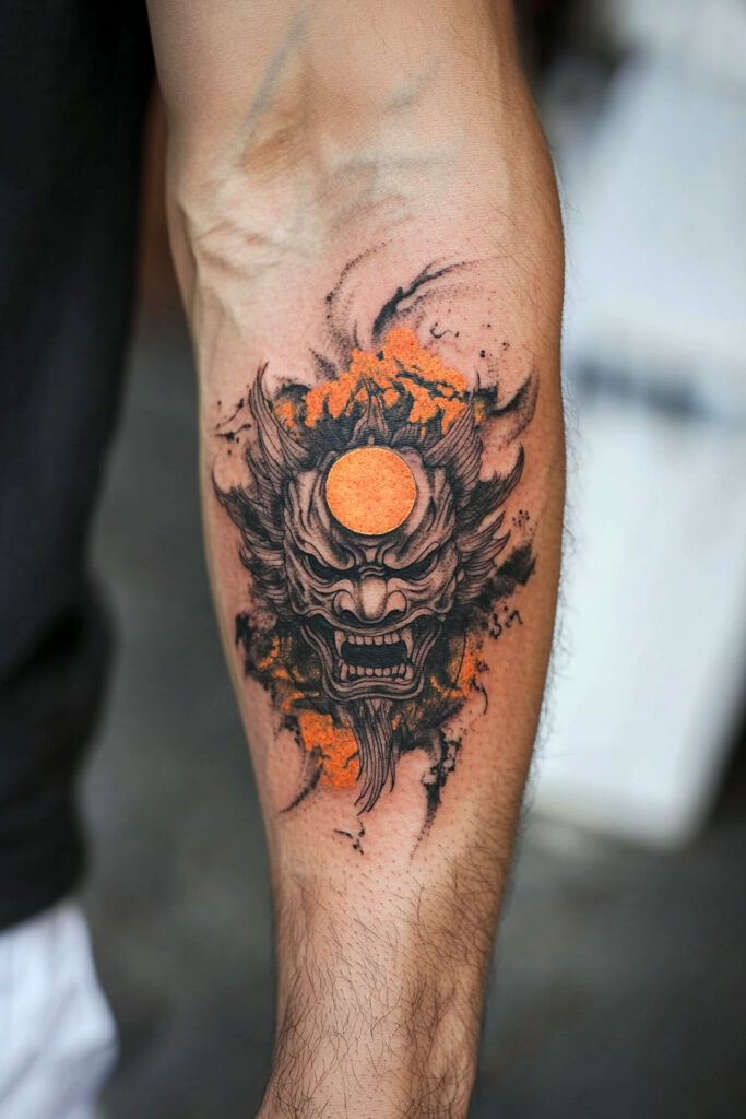 Flames often represent passion, destruction, and purification. A Flaming Oni Mask Tattoo takes the fearsome presence of the Oni to the next level by enveloping it in fire. The flames can swirl around the mask or emerge from its eyes and mouth, giving the tattoo a hellish, otherworldly appearance. This fiery design is a statement of intensity and personal transformation.