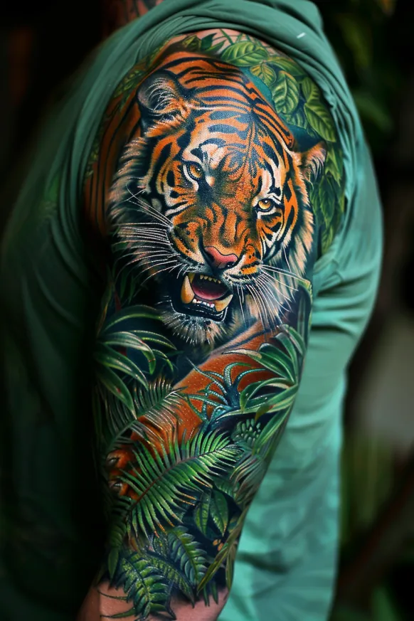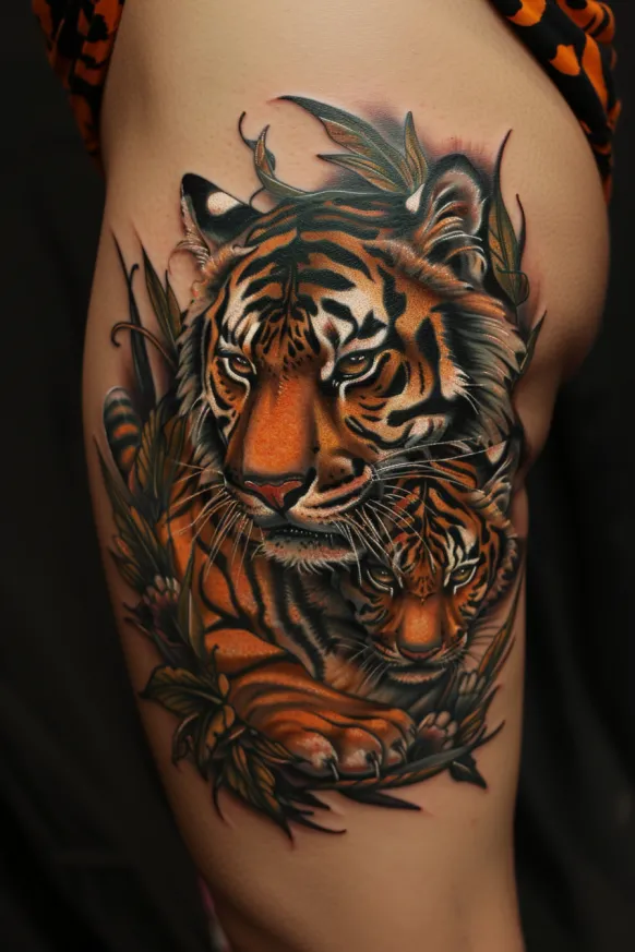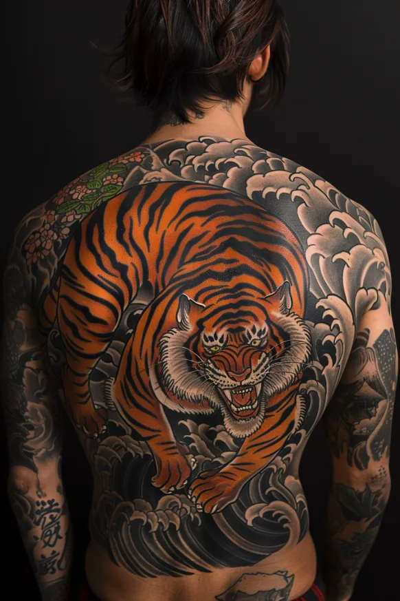 In Japanese mythology, tigers symbolize protection against bad luck, evil spirits, and disease. The Japanese tiger tattoo (often part of a larger Irezumi piece) is a dramatic and detailed depiction with flowing lines and windswept fur. These designs often blend natural elements like wind, clouds, and water.