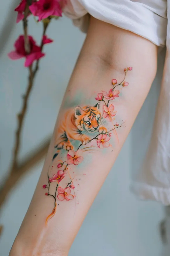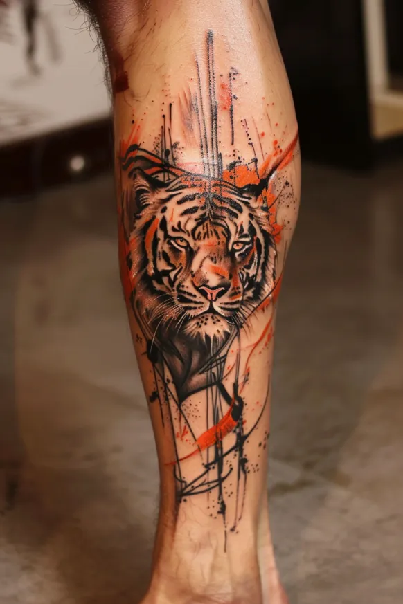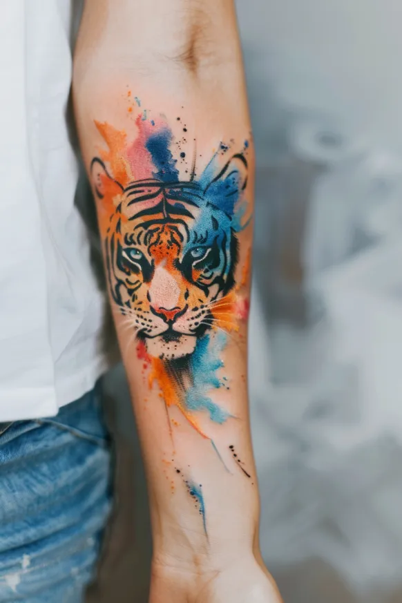Combining the power of a tiger with the softness of watercolor brush strokes creates a beautiful contrast. A watercolor tiger tattoo uses splashes of color and abstract elements to add movement and creativity. These tattoos often look like a painting brought to life on the skin.