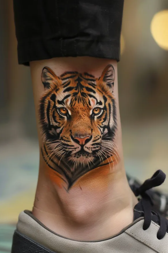 A tiger face tattoo focuses solely on the majestic expression of the tiger, allowing the intensity of the eyes and sharpness of the features to shine. This type of design is ideal for showcasing emotion and strength in a compact format, often placed on the forearm, calf, or shoulder.