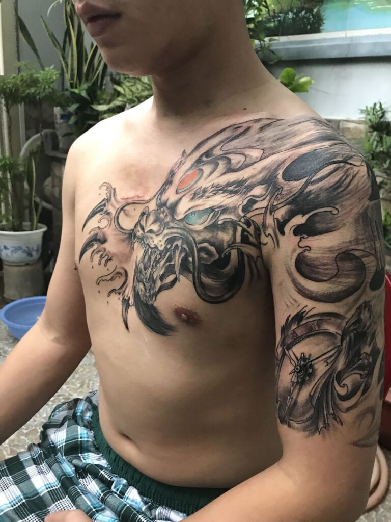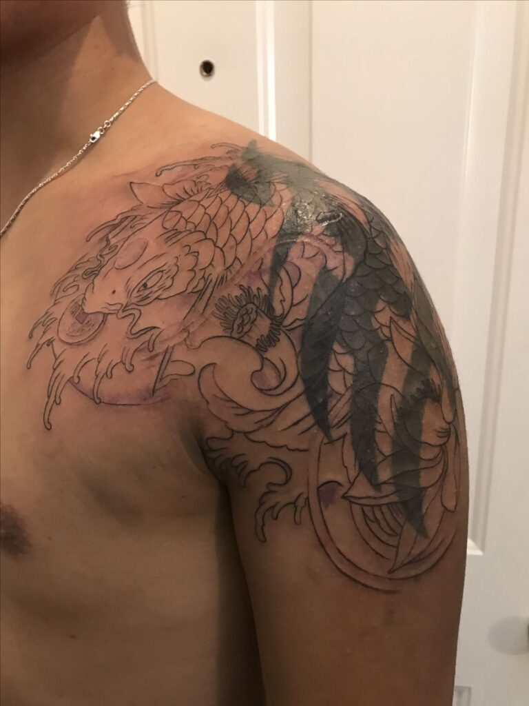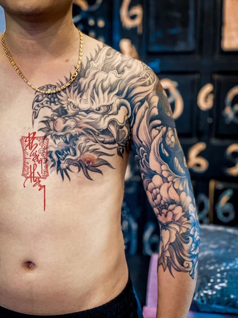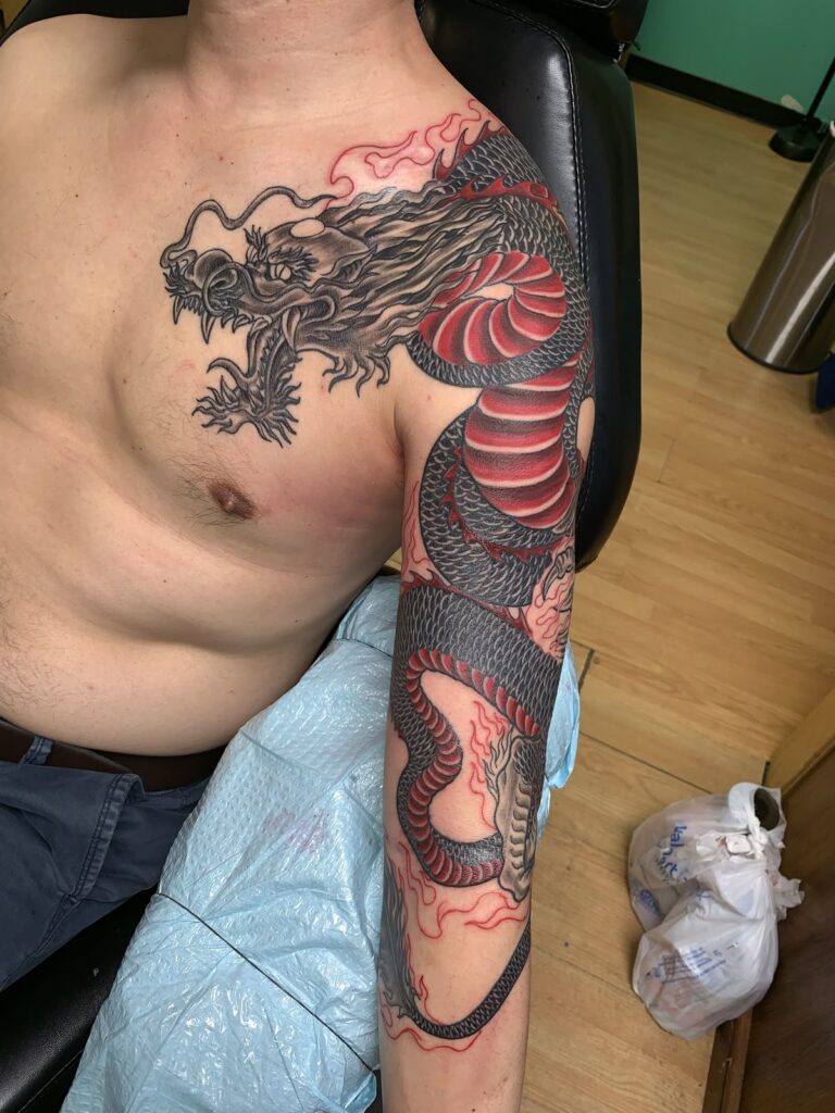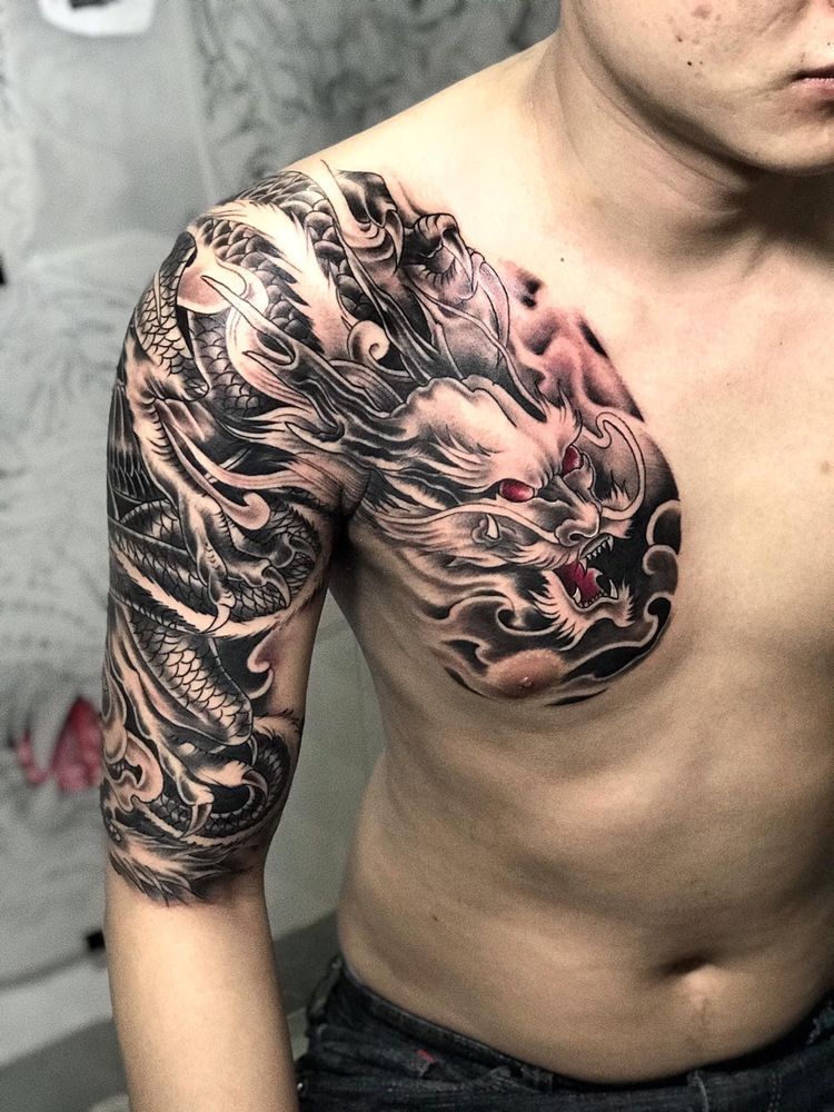Artists often wrap the dragon around the shoulder to create movement and depth.