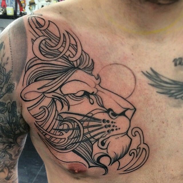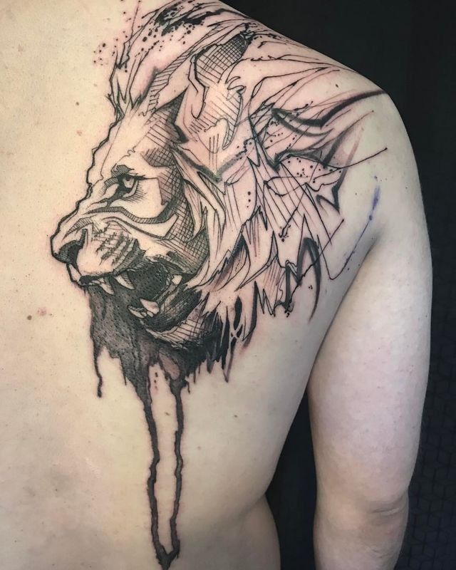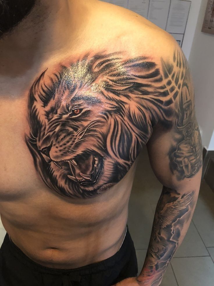 The shoulder placement allows the lion’s mane to spread outward, which makes the tattoo look dramatic.