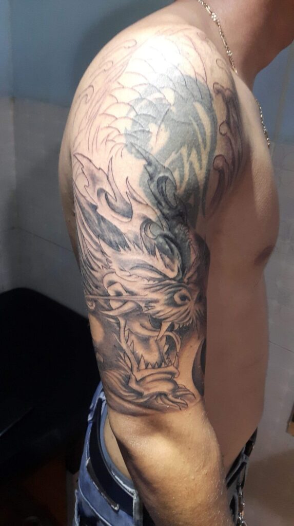 Dragons symbolize power, wisdom, and protection. Their long bodies fit perfectly along the shoulder and upper arm.