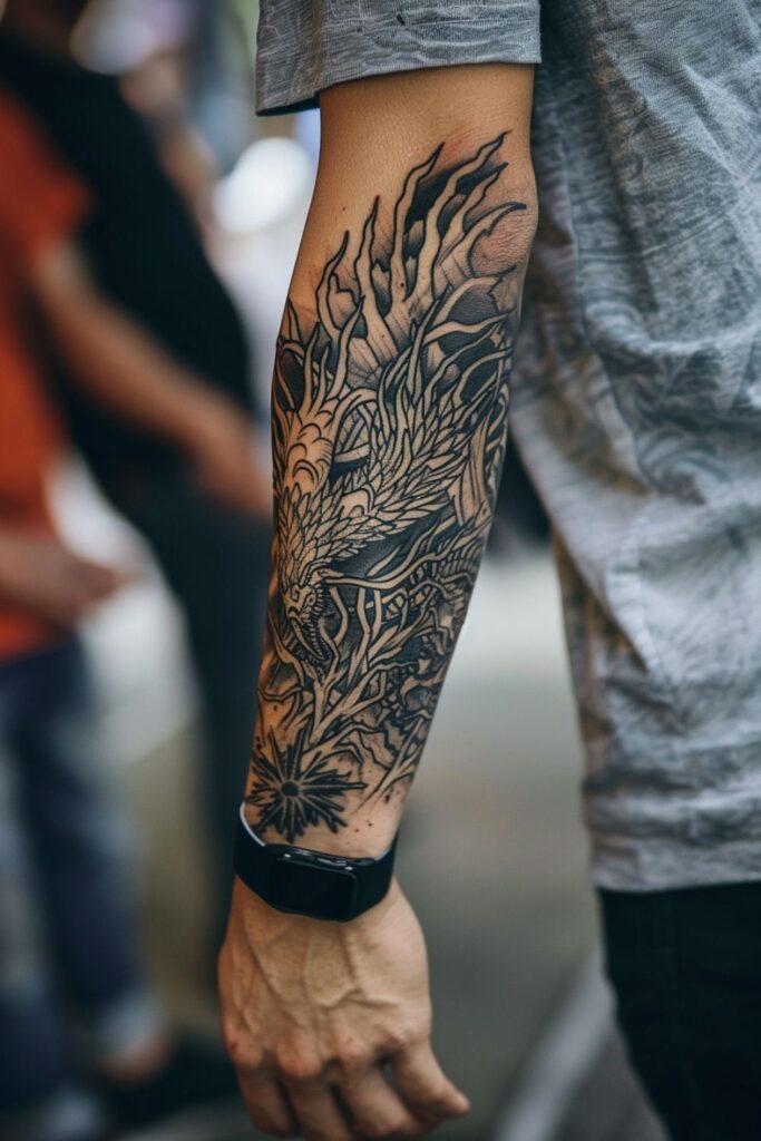 Few tattoo styles command a room the way a Japanese dragon does. This design typically features a sinuous dragon coiling from the wrist toward the elbow, rendered in the bold lines and rich color palette of traditional Irezumi art. The dragon symbolizes wisdom, protection, and strength in Japanese culture — making it more than just a stunning visual, it’s a meaningful statement. The way the figure wraps around the arm gives it a three-dimensional, living quality that flat designs simply can’t match. If you want masculine forearm tattoos with cultural depth and serious visual weight, this is a top-tier choice.