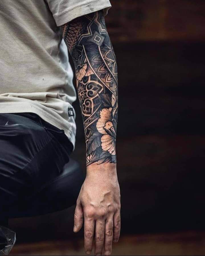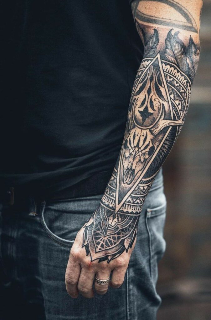 Geometric tattoos have evolved far beyond basic shapes. Today’s artists use sacred geometry, optical illusions, and precise linework to create patterns that look almost architectural on the skin. A geometric piece that begins at the forearm and hints at a future sleeve is an investment in long-term body art. The black ink contrasts sharply against skin, and the clean angles give the tattoo a modern, almost futuristic feel. Men who appreciate structure, symmetry, and minimalism without sacrificing impact tend to gravitate toward this style.