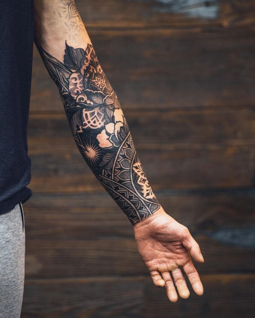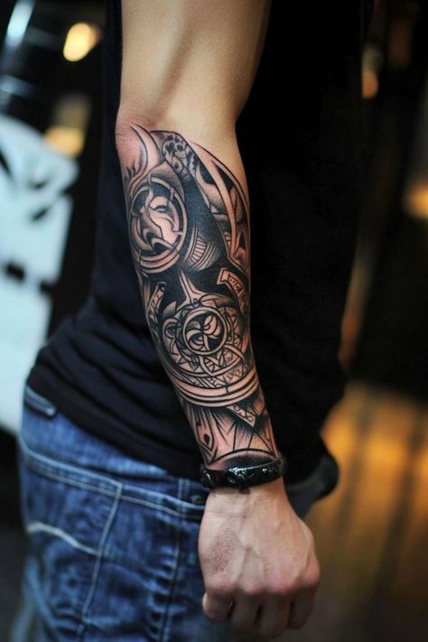 Tribal tattooing has one of the longest histories in human culture, and Polynesian, Maori, and Filipino styles are among the most visually striking. These designs use bold, interlocking black shapes — spirals, chevrons, interlocking lines — to tell stories about identity, heritage, and community. If you have genuine cultural ties to these traditions, a tribal forearm piece is a powerful way to honor that lineage. If you’re drawn to the aesthetic without the heritage, it’s worth researching the symbolism and working with a knowledgeable artist who respects the tradition. Done well, tribal masculine forearm tattoos have an undeniable presence.
