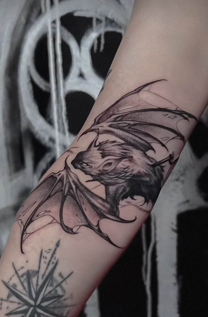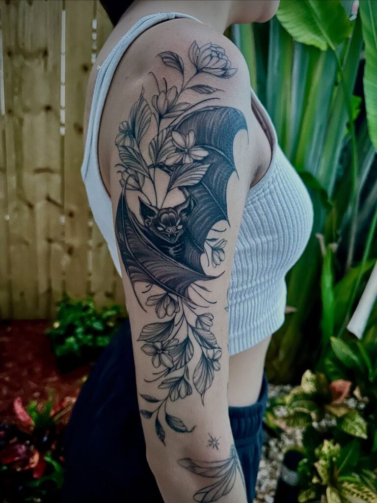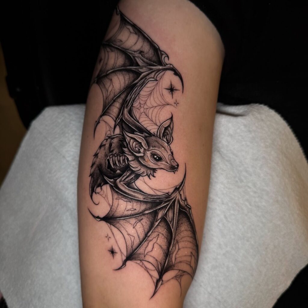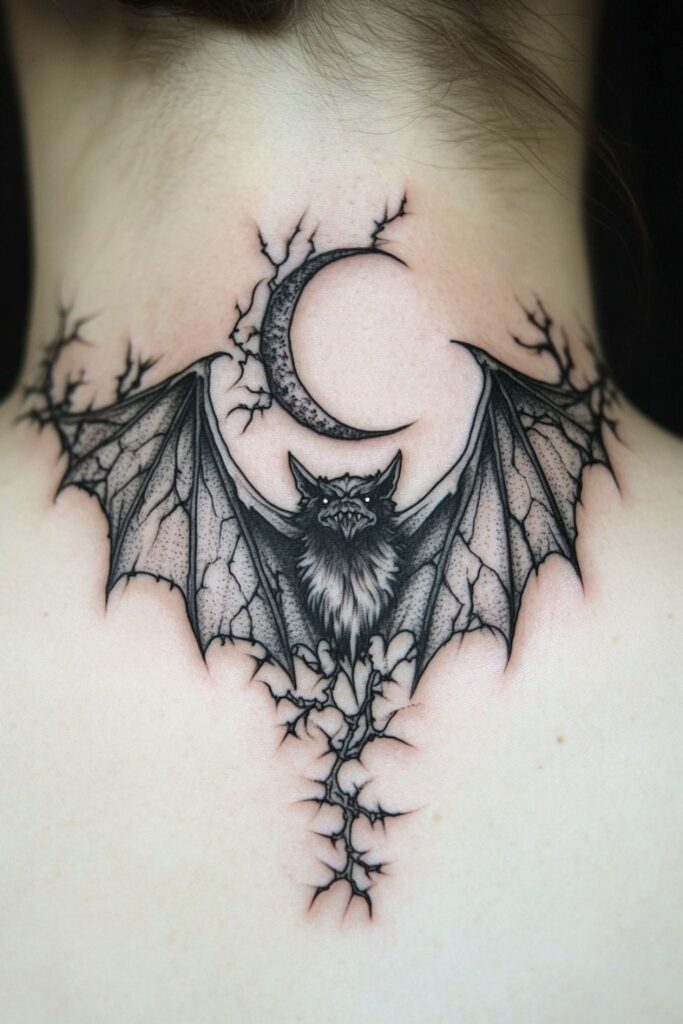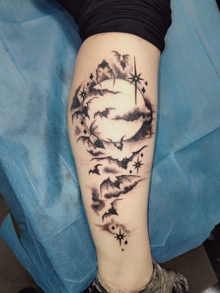 Multiple bats flying across the skin create rhythm and storytelling. I’ve seen this done beautifully along ribs or collarbones, where the body’s natural curve adds motion.