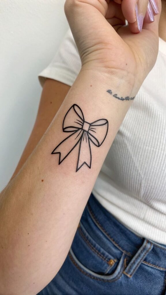 Minimalist bow tattoos speak to people who value quiet confidence. A few fine lines form a bow, and suddenly you have a tattoo that feels modern and intentional. I love how this style feels effortless without looking lazy.