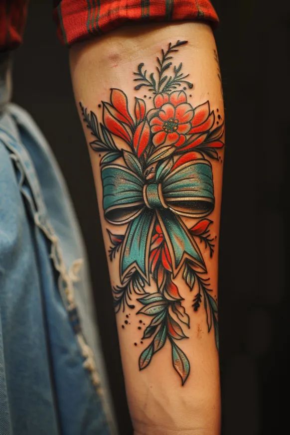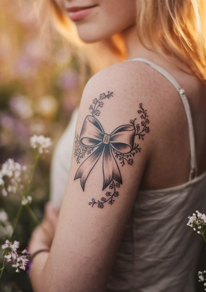 Floral bow tattoos blend softness with resilience. Flowers bring emotional depth, while the bow ties everything together—literally and symbolically. I usually see roses, lilies, or wildflowers paired with bows.