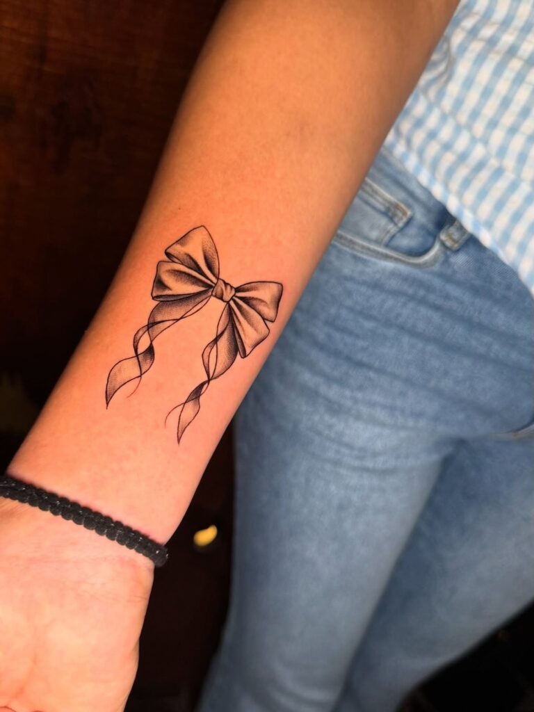 This style turns a bow tattoo into a story marker. Adding a name or date makes the design deeply personal without looking heavy. I’ve seen people use this for kids’ names, anniversaries, or turning points in life.