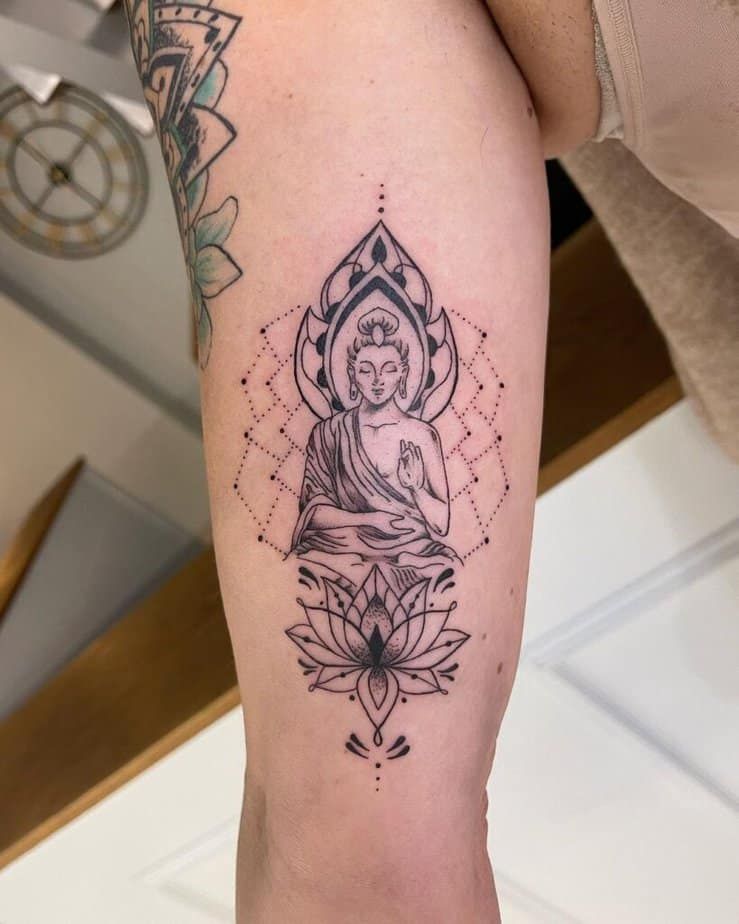 2. Lotus + Buddha Hand Tattoo – Calm Meets Growth