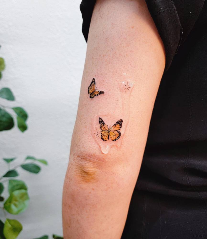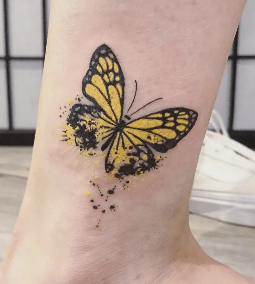 Watercolor tattoos are loved for their artistic and painterly style. A watercolor butterfly tattoo looks vibrant, fluid, and unique, representing freedom of expression and creativity. Best placements include the forearm, calf, or back.