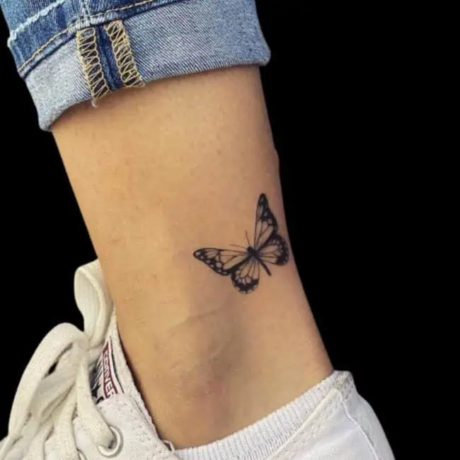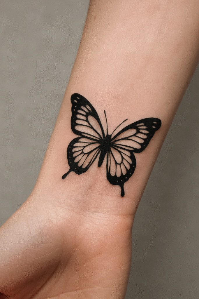 A simple black butterfly tattoo is timeless and versatile. It represents elegance, transformation, and personal growth without needing bold colors. Perfect for minimalists, this design fits well on the wrist, ankle, or behind the ear.