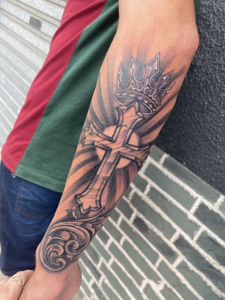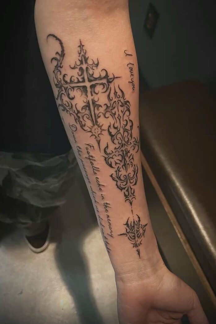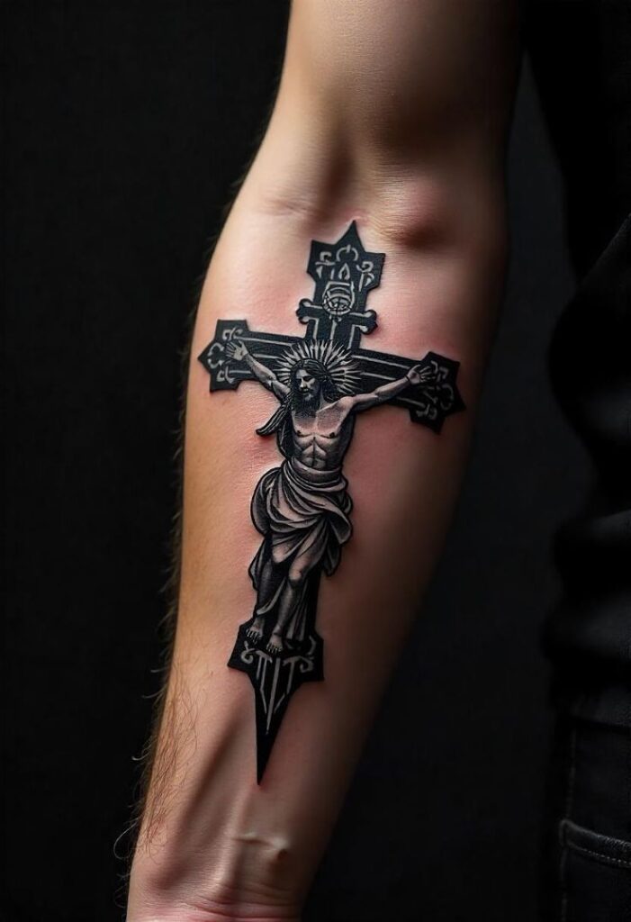 Let’s talk placement for a second. Cross tattoos on the arm—especially for men—never lose appeal.