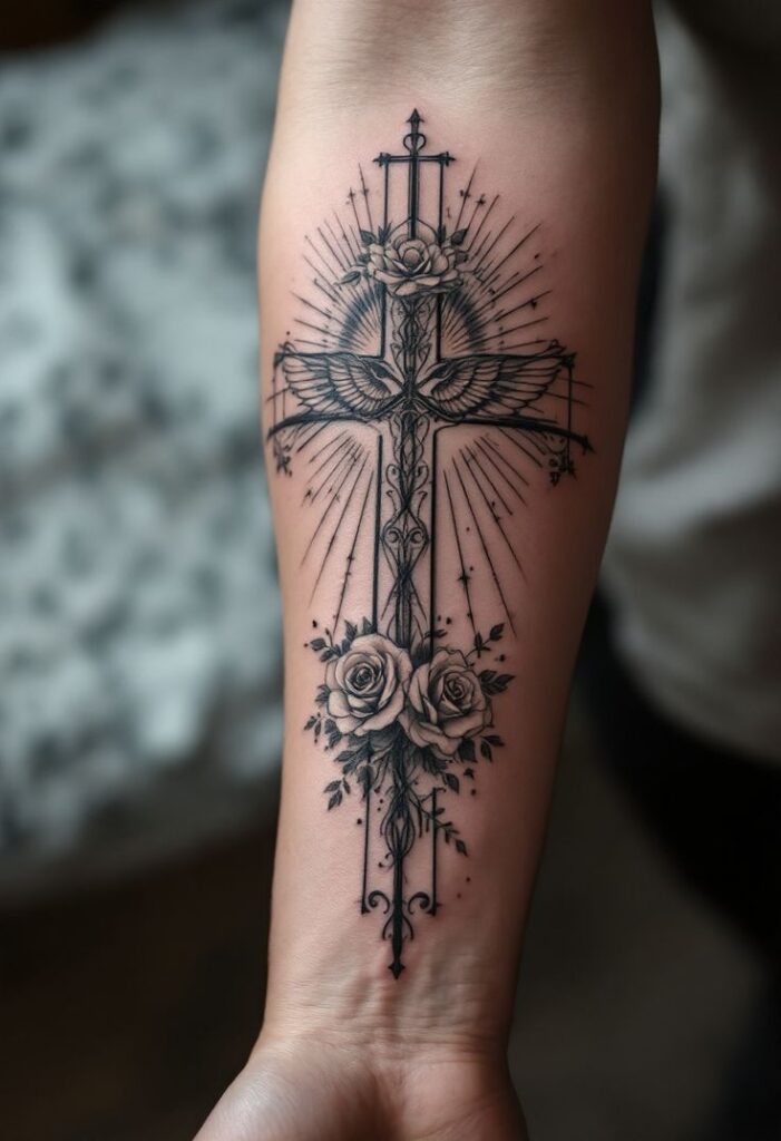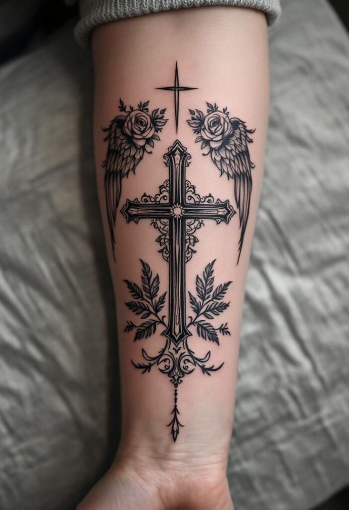If you already love angel imagery, you’ll probably enjoy this deep dive on angel tattoo designs too. The flowing wings soften the structure of the cross and give it movement.