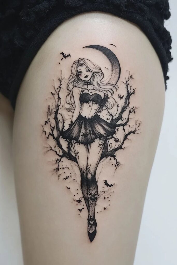 The moon is a central symbol in gothic imagery, often linked to cycles, mystery, and hidden truths. Combined with bats, it creates a haunting and beautiful tattoo design. A dark gothic tattoo featuring a crescent moon with bats flying across the night sky reflects themes of transformation, secrecy, and freedom in darkness.
