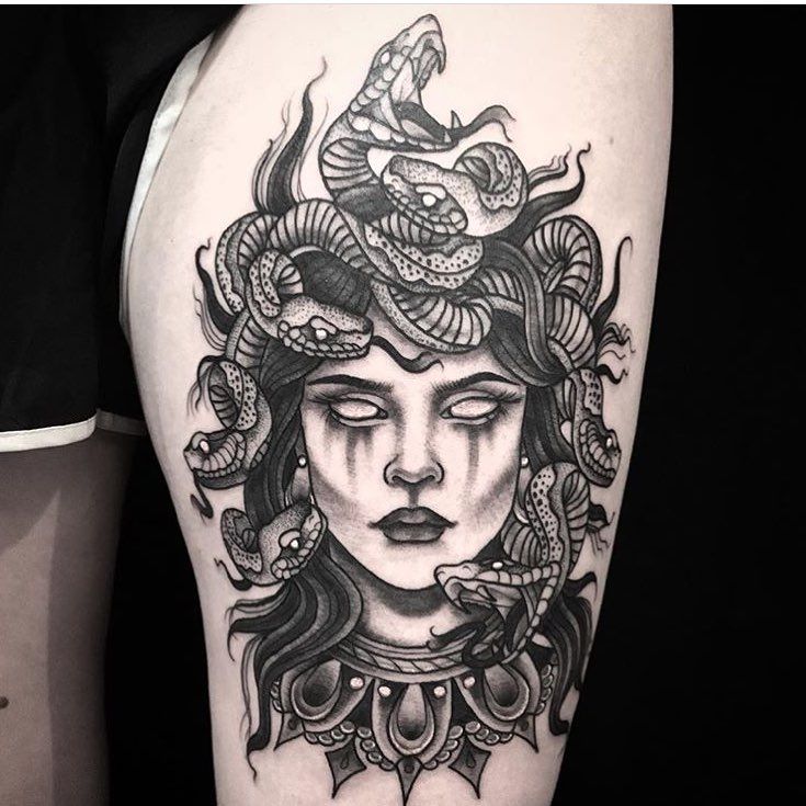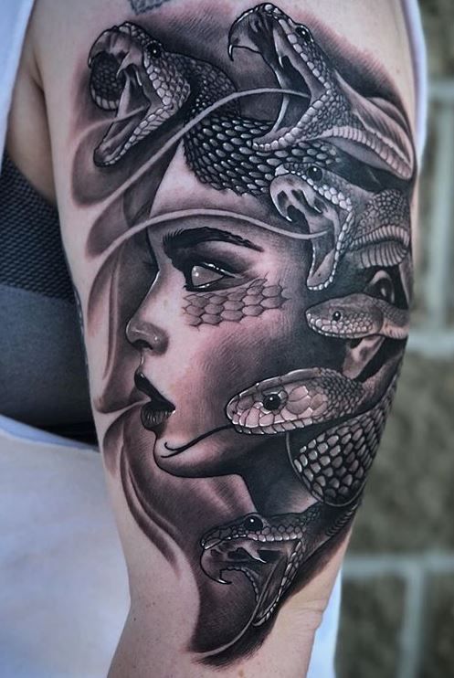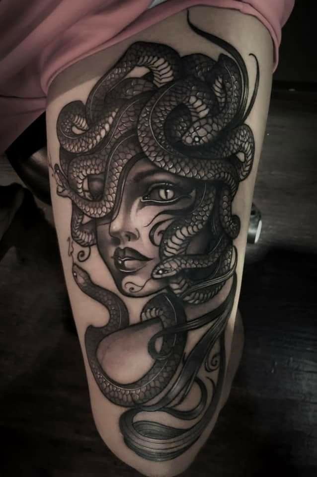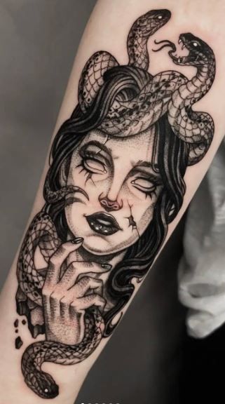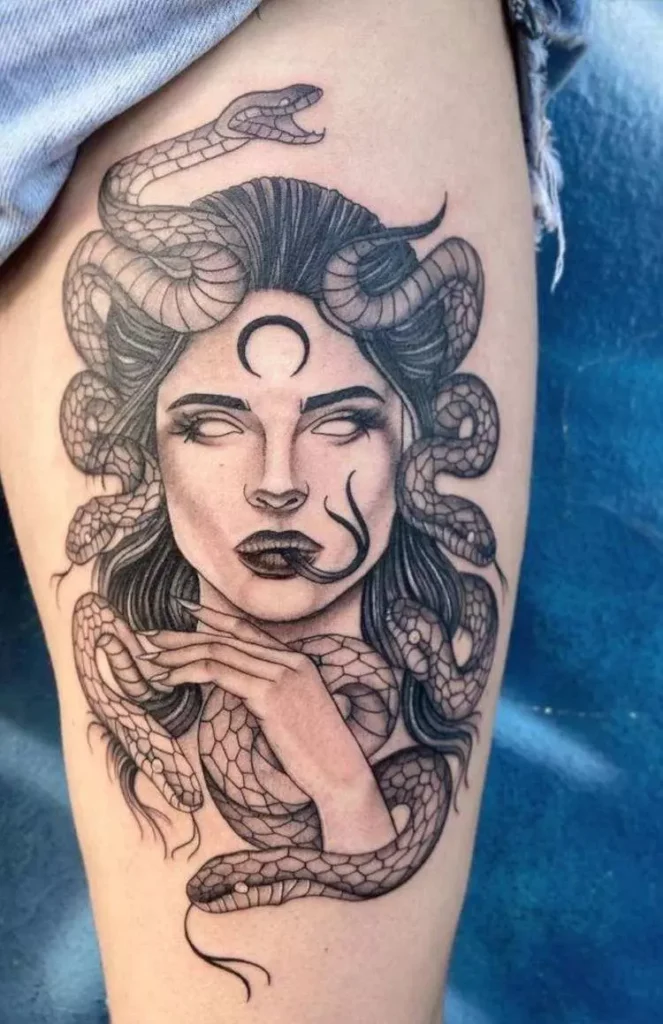 While Medusa herself is iconic, her snakes are equally significant. A dark tattoo that emphasizes the snakes rather than her face creates a more abstract but equally powerful design. The snakes may intertwine into gothic patterns, spiral into hypnotic shapes, or even form a protective barrier around her. Snake-dominant designs highlight transformation, rebirth, and the duality of danger and beauty. They are an excellent choice for those who want a darker, more symbolic representation of Medusa.