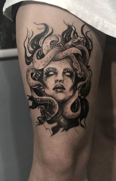 The eyes of Medusa are among her most famous attributes, as they were said to turn men into stone. A tattoo that focuses heavily on her eyes can be both chilling and mesmerizing. Dark shading around her face, glowing pupils, or abstract eye patterns can create a sense of unease and power. For many, this design represents the strength of vision, awareness, and the ability to face challenges head-on. It is a symbolic reminder of inner strength and the dangers of underestimating someone.