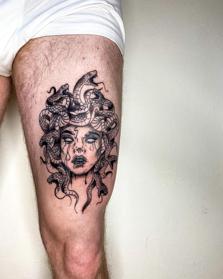 Medusa’s story is deeply tied to other figures in Greek mythology, such as Perseus, Athena, and Poseidon. A tattoo that incorporates these elements adds more depth to the design. Dark depictions of Perseus holding Medusa’s head, or Athena in the background, give context to her tragic tale. These tattoos not only honor Medusa herself but also explore the broader mythology, making them ideal for those who appreciate storytelling through body art.