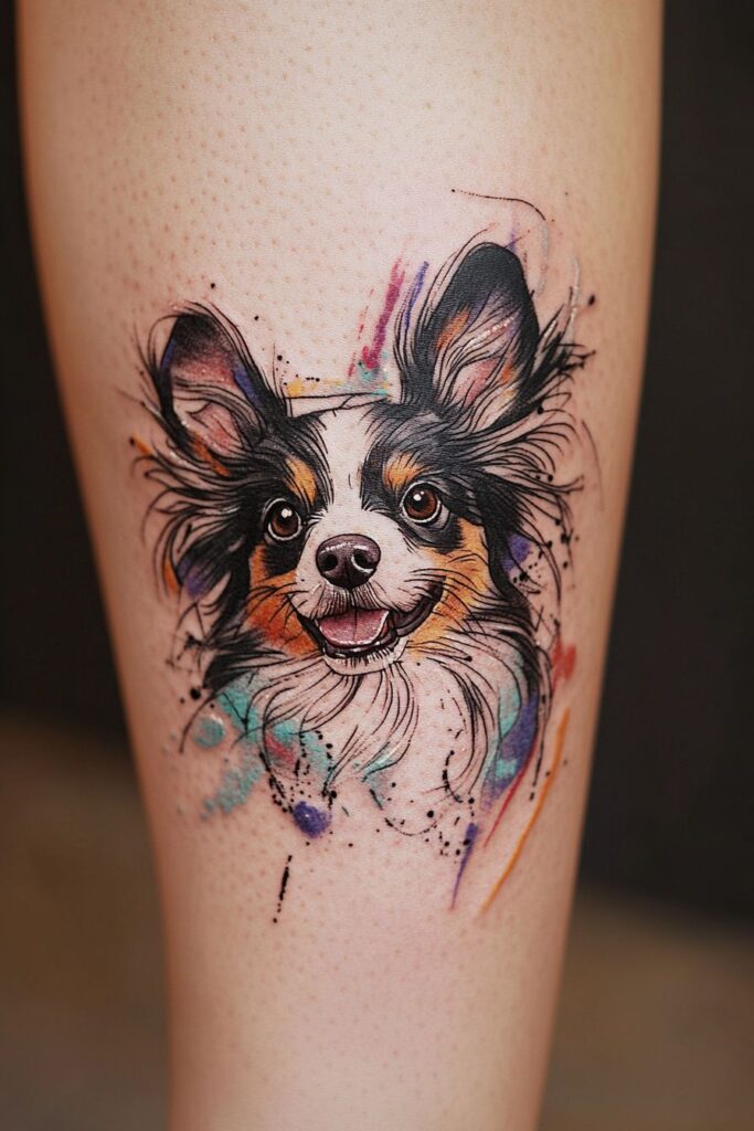 Watercolor dog tattoo designs add color splashes that feel emotional and expressive. These tattoos often blend realism with abstract color, which feels poetic instead of literal.