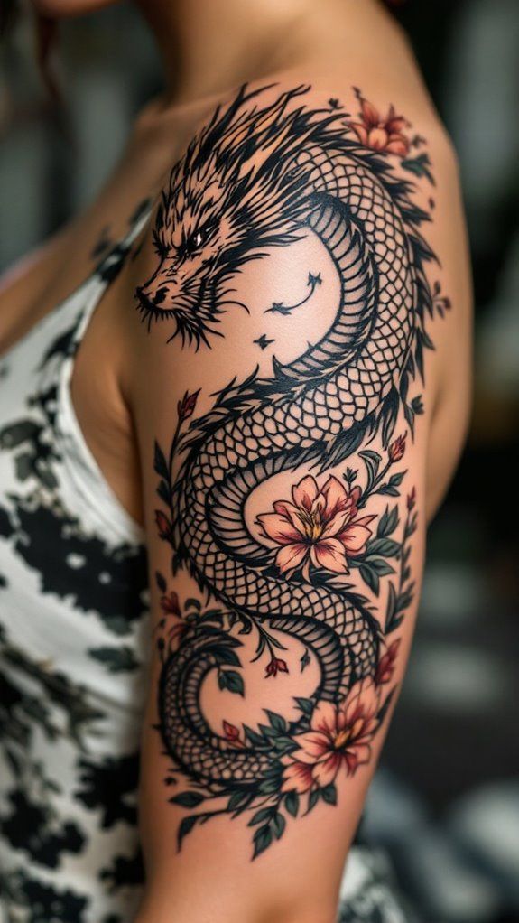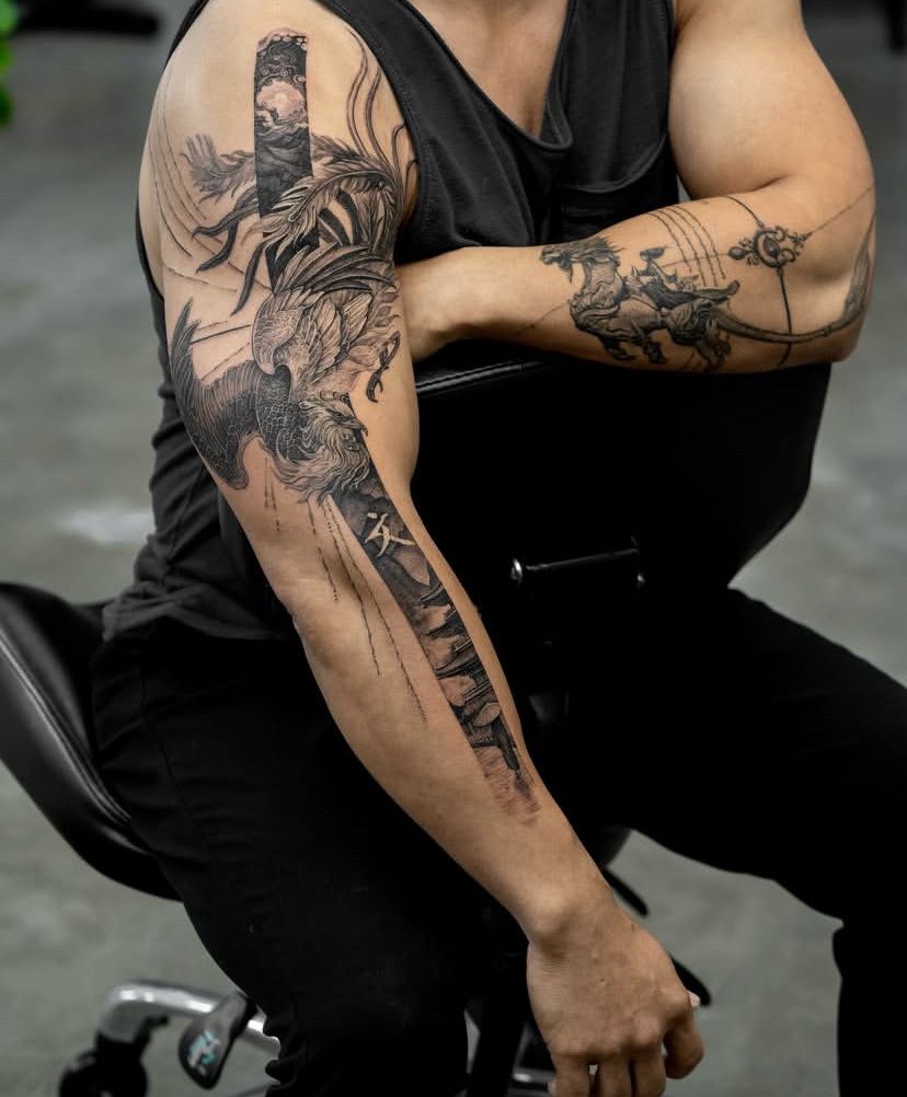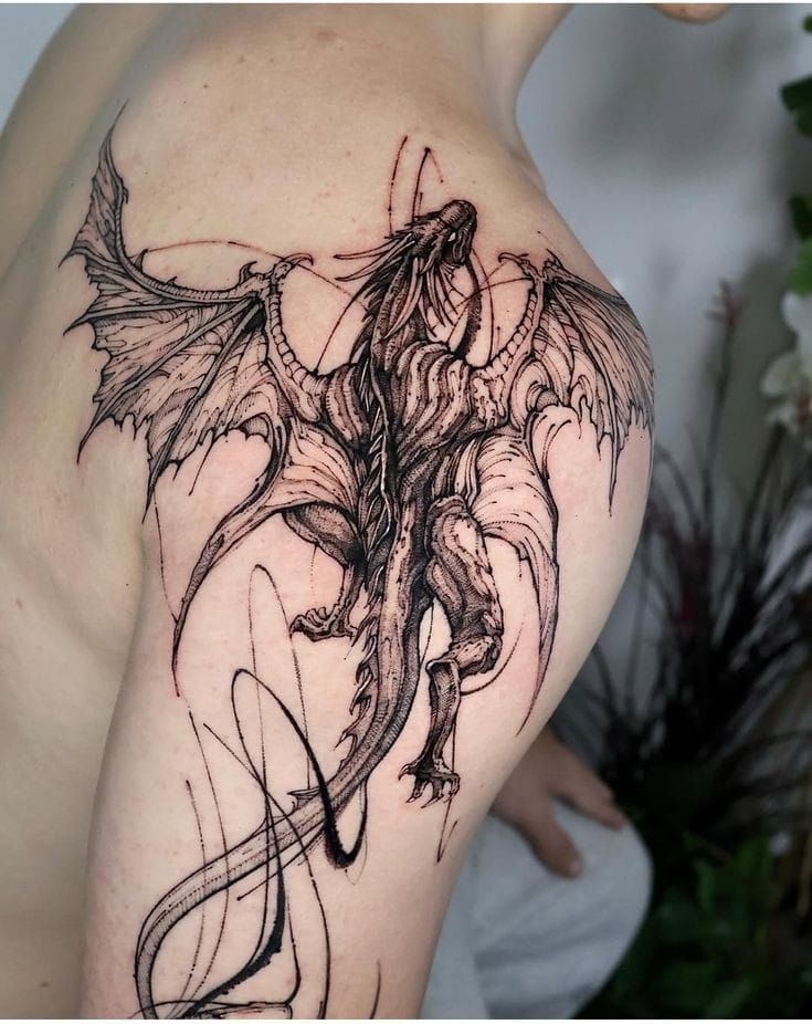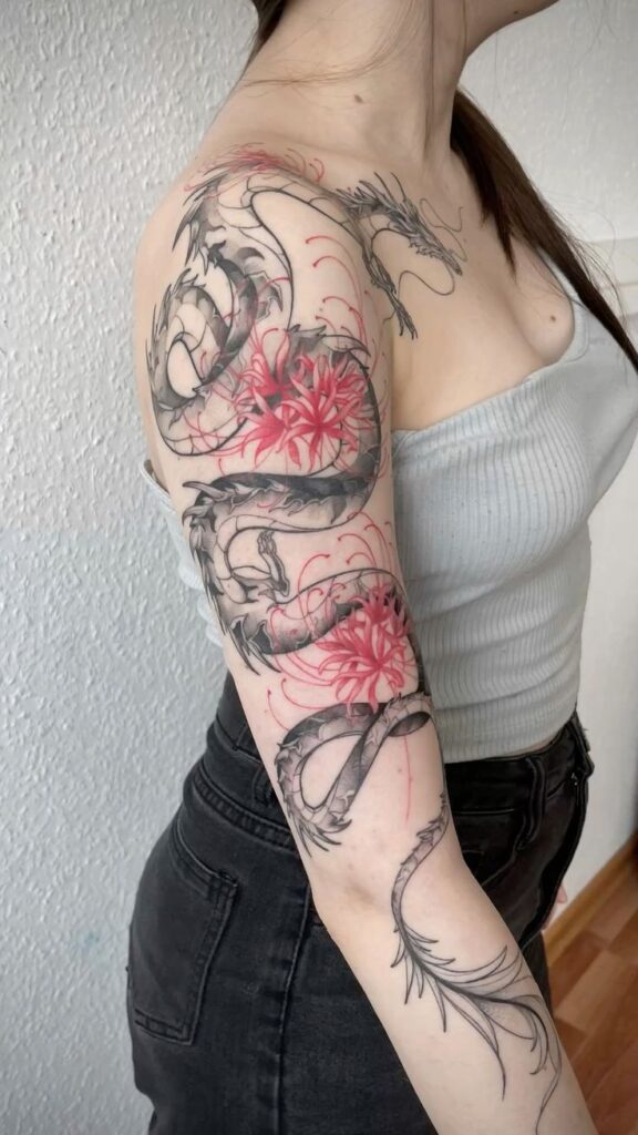 Now we’re talking drama. A dragon tattoo wrapped around arm and shoulder adds scale and presence.