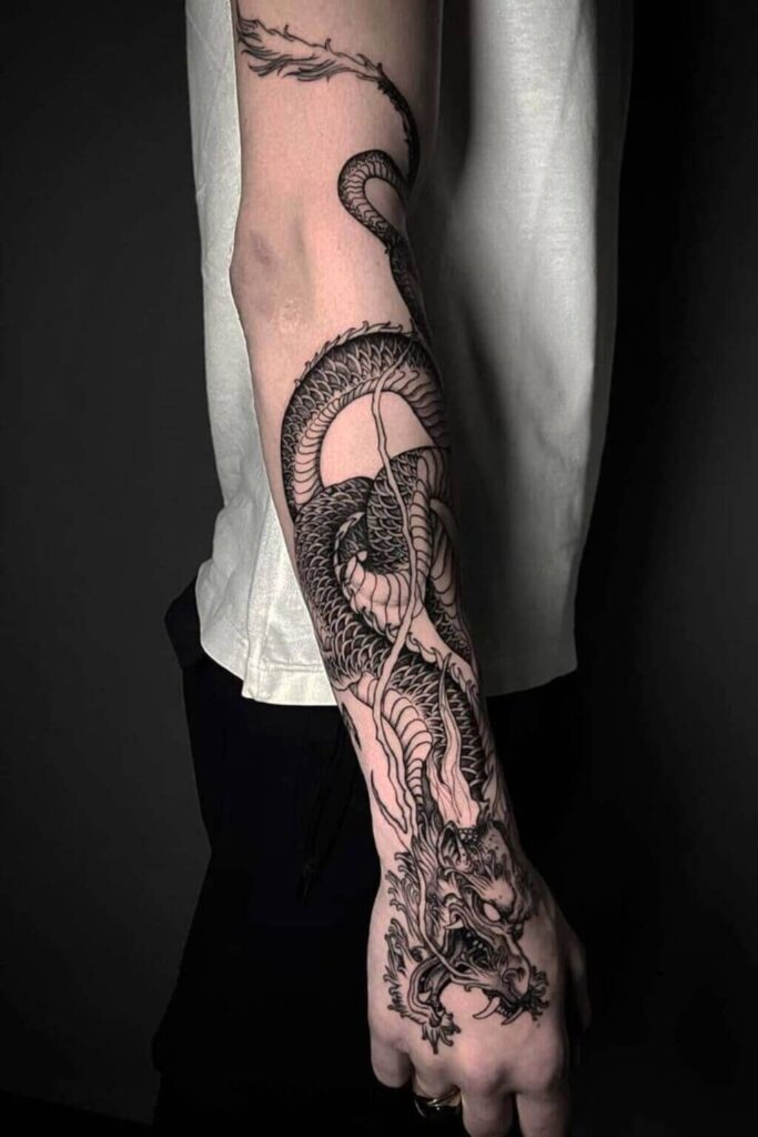 I’ve seen this style wrap from wrist to shoulder, and IMO, that flow alone makes it legendary. The dragon coils naturally around the arm muscles, which makes even a relaxed arm look flexed.