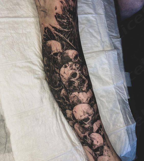 Ravens and crows are powerful symbols in gothic culture, often representing mystery, transformation, and the connection between life and death. A goth tattoo sleeve featuring these birds in flight, perched on skulls, or surrounded by shadows captures a haunting yet elegant vibe. Dark shading and detailed feathers can bring this design to life, making it both intimidating and mesmerizing.