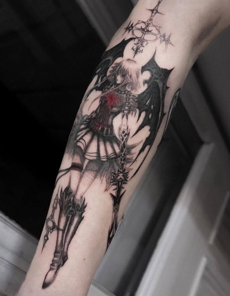 The eternal struggle between light and darkness is a recurring theme in gothic culture. A sleeve that combines angelic figures with demonic forms creates a dramatic visual story. Black and gray shading enhances the contrast between good and evil. This type of sleeve often symbolizes inner battles, personal transformation, and spiritual conflict, making it a meaningful choice for those who embrace the complexity of human nature.