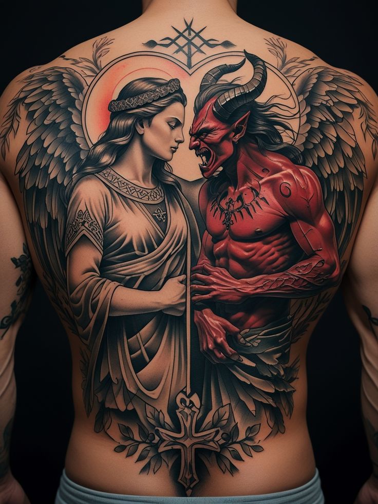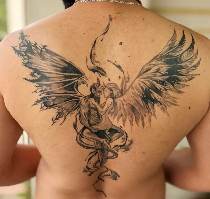 If you want detail, depth, and drama, a half angel half demon tattoo back delivers all three.