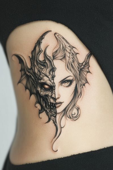 A half angel half demon tattoo women design often blends elegance with intensity. Think flowing hair, delicate wings, and expressive eyes.