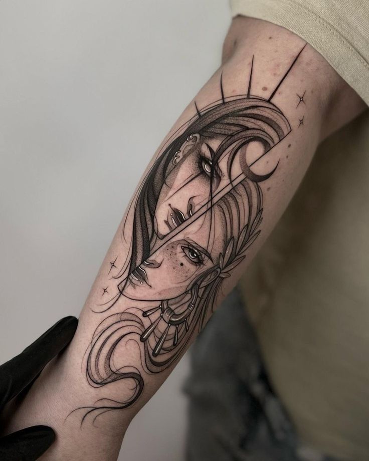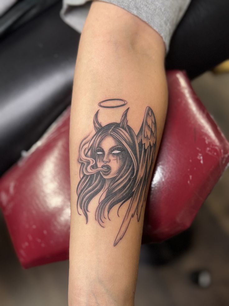 A half angel half demon tattoo forearm placement puts your story on display. Every glance becomes a reminder of who you are.