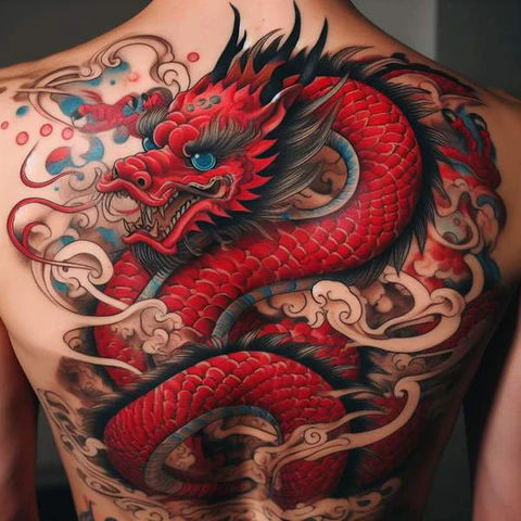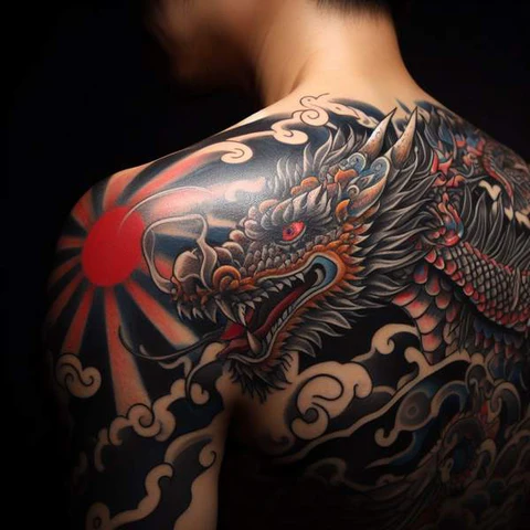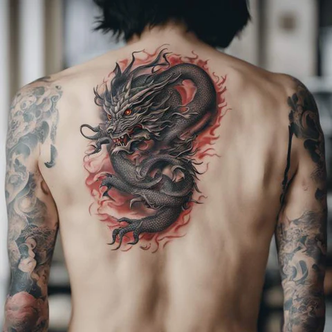 The back provides a broad canvas for a Japanese dragon back tattoo. This design often depicts a full-bodied dragon soaring across the skin with detailed scales, waves, and fire. Such tattoos are highly detailed and considered masterpieces, reflecting both artistry and dedication.