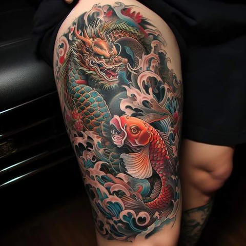 The combination of a Japanese dragon and koi fish tattoo is deeply symbolic. The koi represents perseverance and determination, while the dragon embodies strength and transformation. Together, they create a powerful story of resilience, growth, and success against all odds.