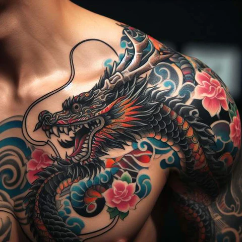 A Japanese dragon chest tattoo symbolizes courage and inner strength, as it sits close to the heart. The broad chest area allows for detailed dragon heads, fiery eyes, and extended claws. This tattoo often carries personal significance and serves as a protective symbol.