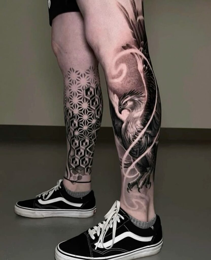 Blackwork tattoos cover sections of the leg in solid black or detailed geometric patterns. It’s perfect if you like strong contrast or want to cover up older tattoos.