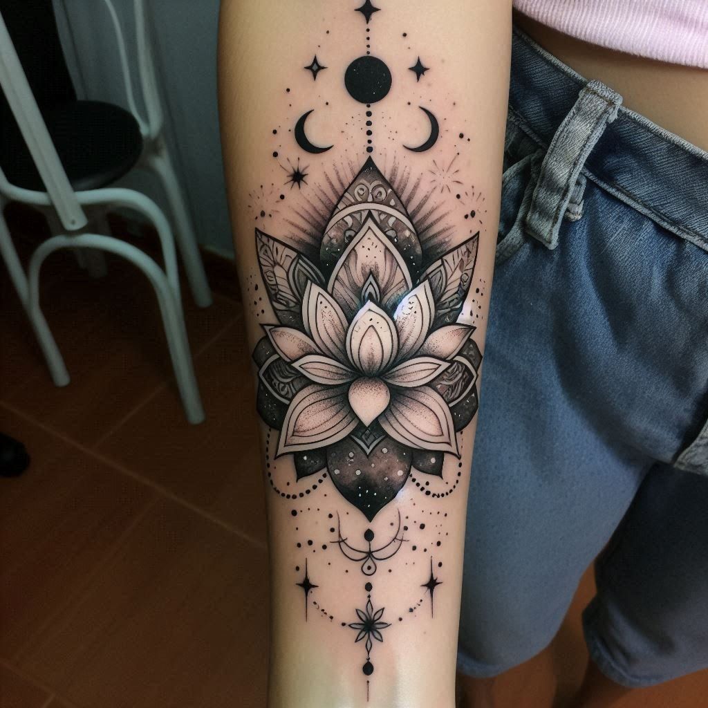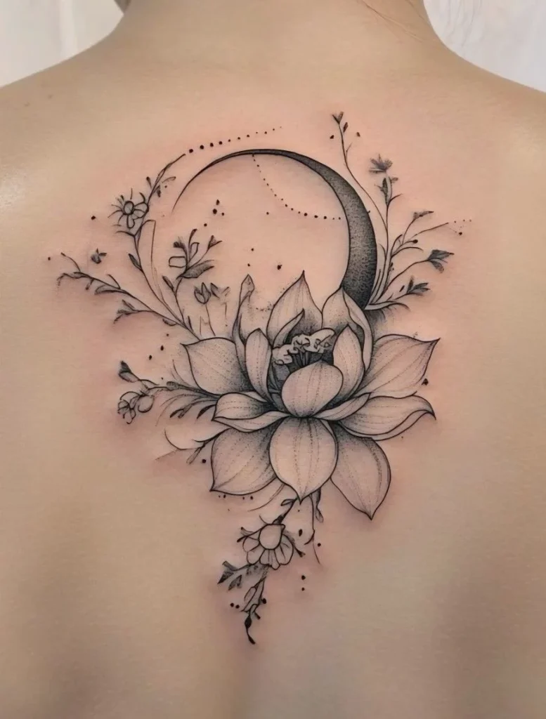 A lotus and moon tattoo connects emotional cycles with growth. The moon reflects change, while the lotus stands steady through it.