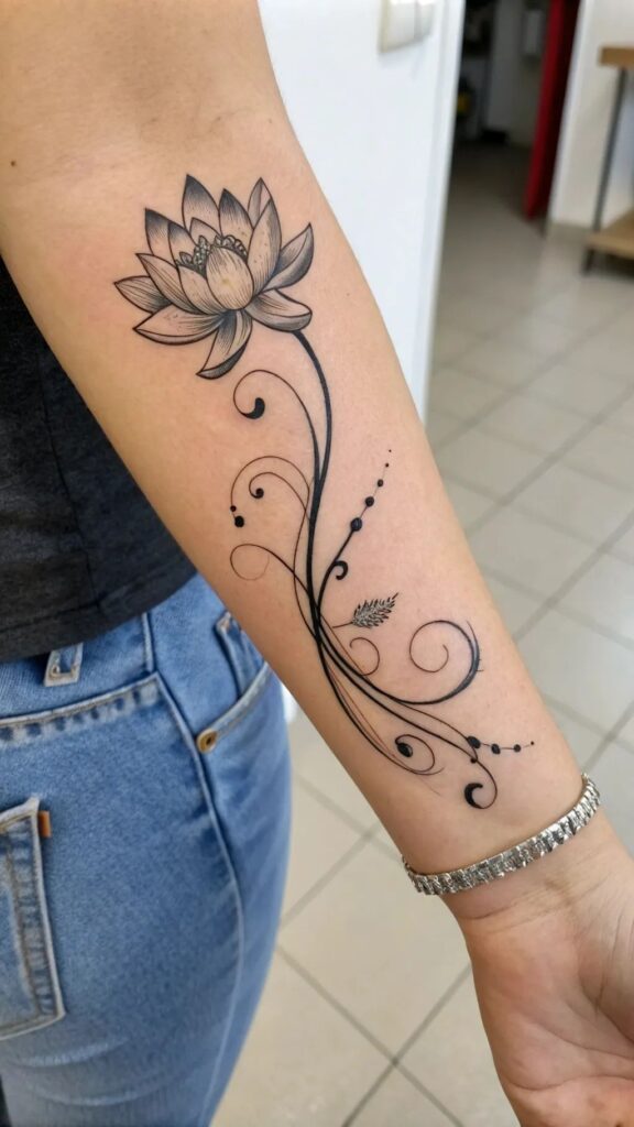Pairing a lotus tattoo with a short quote turns your ink into a reminder you can’t ignore. The trick? Keep the text tight and intentional.