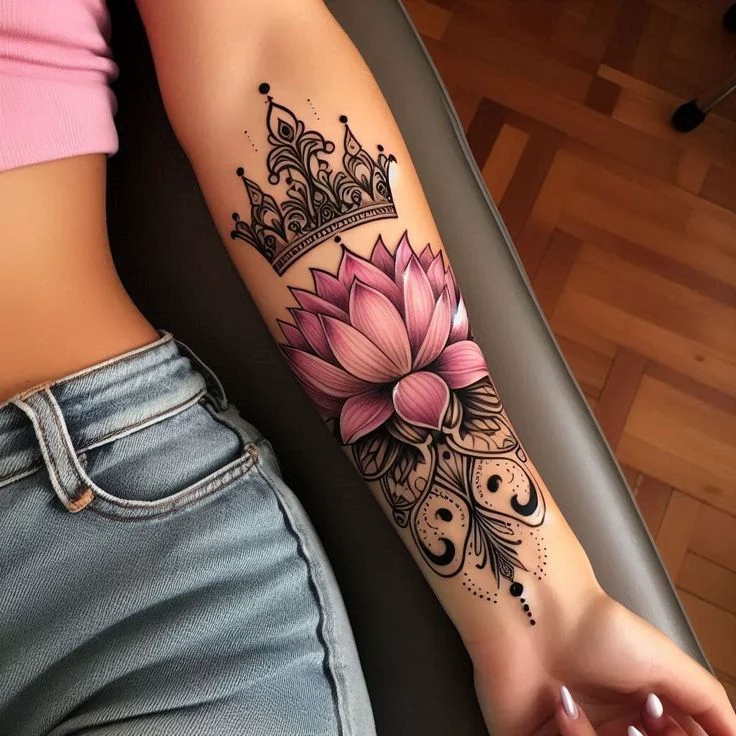 A lotus tattoo paired with spiritual symbols—like chakras, mantras, or divine imagery—creates layered meaning. It feels sacred without feeling preachy.
