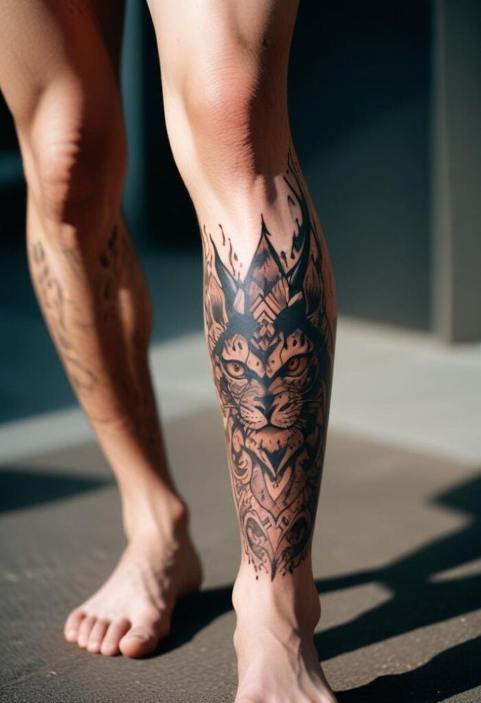 Lion tattoos represent leadership, courage, and dominance. A realistic lion face placed on the calf creates intense visual focus. The muscle curve helps emphasize shadow and texture.