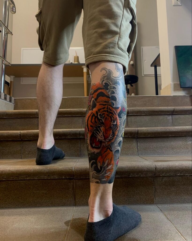 Japanese dragon tattoos bring energy and mythology into one striking design. Their flowing forms naturally wrap around the calf muscle. This placement enhances the tattoo’s dynamic movement.