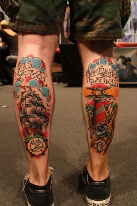 Tribal tattoos emphasize flow and strength. Bold black patterns create a strong masculine presence. This style works particularly well on muscular calves.