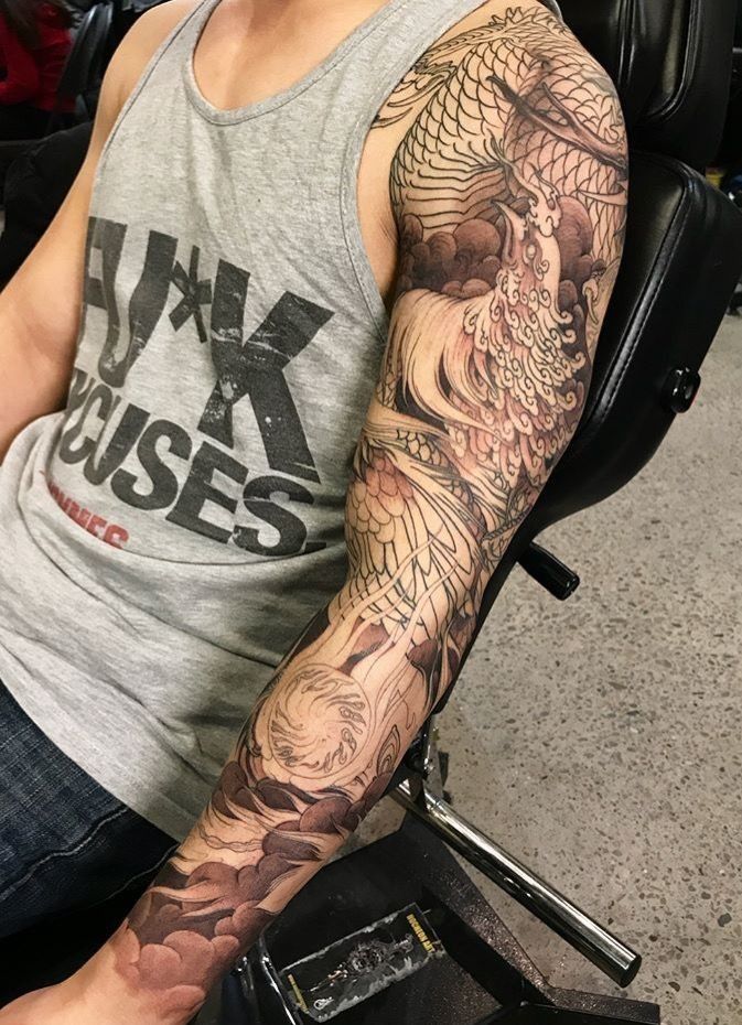 Japanese dragon sleeves look legendary. The dragon winds down the arm with clouds, waves, and wind patterns that create movement throughout the tattoo.