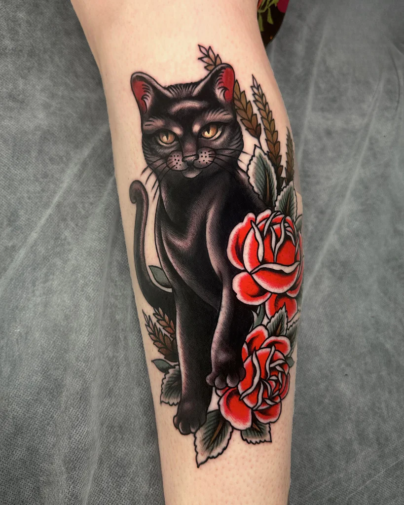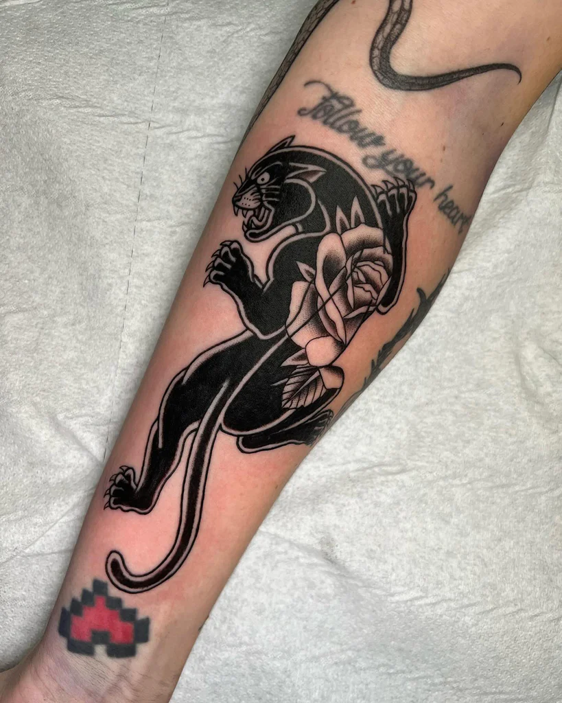Panthers in old school tattoo designs symbolize power, courage, and primal strength. These tattoos are often inked in dynamic poses, with open jaws and extended claws, emphasizing their ferocity. The bold black ink used in panther tattoos creates a dramatic contrast, making them one of the most striking traditional tattoo choices. Beyond their intimidating appearance, they can also represent protection, guardianship, and inner strength.