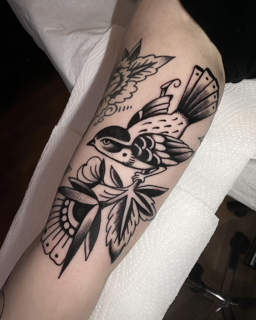 Swallow tattoos have been a staple in the old school tradition since the early days of maritime exploration. Sailors believed that swallows brought good luck and ensured safe returns home, as these birds were often spotted near land after long voyages. With their distinctive design and vibrant colors, swallow tattoos represent freedom, hope, and safe passage. In modern times, they also symbolize love and loyalty, often inked in pairs to represent companionship.