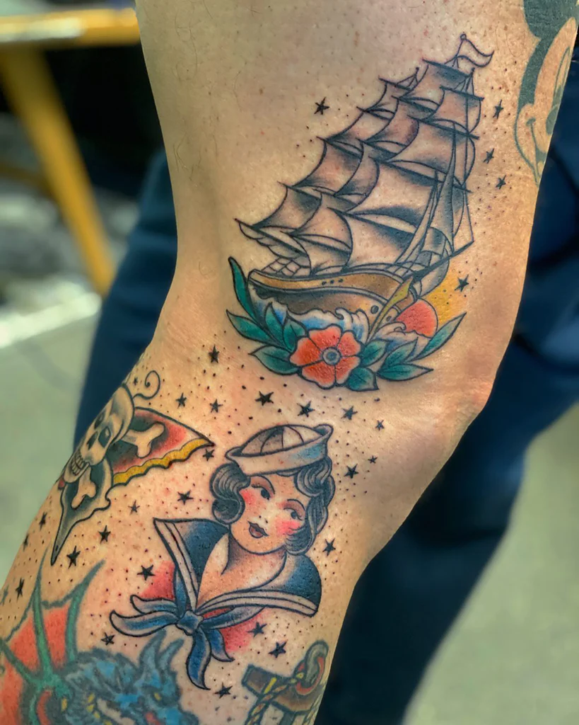 The ship tattoo embodies the adventurous spirit of old school tattooing. For sailors, ships were a second home and a representation of both freedom and uncertainty. A ship tattoo often signified the wearer’s journey through life, their resilience against storms, and their hope for safe returns. With billowing sails and ocean waves, these tattoos showcase intricate old school artistry while carrying deep symbolism of exploration and determination.