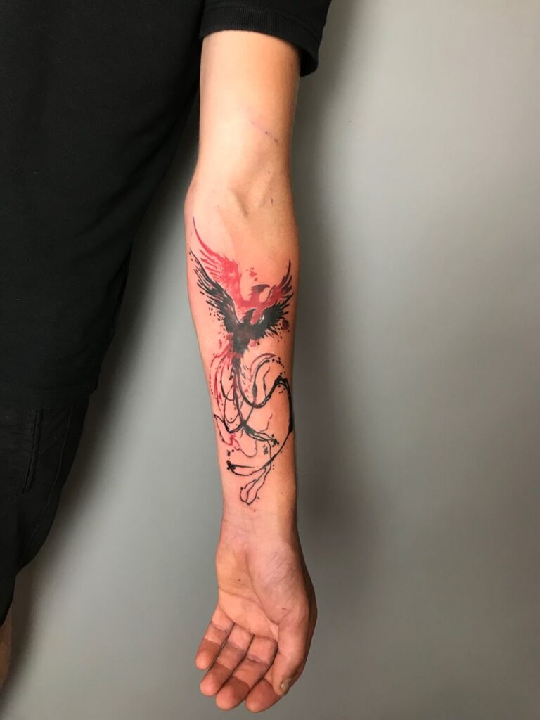 Watercolor phoenix tattoos blend soft splashes of color with loose outlines. I like this design because it feels raw and expressive, almost like art therapy in ink. Every piece looks slightly different, which makes it feel personal.