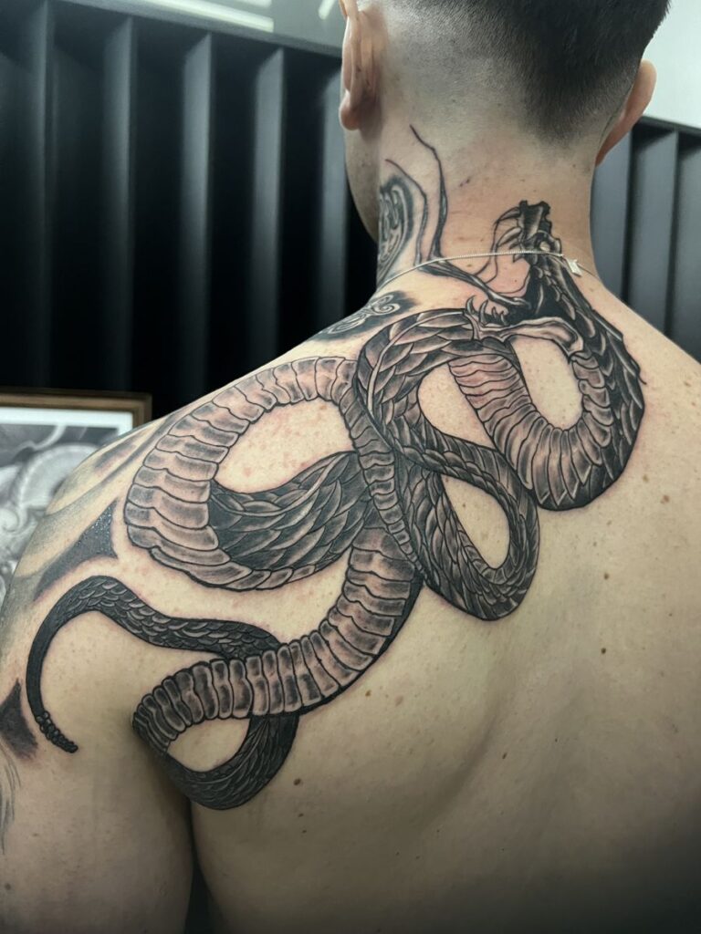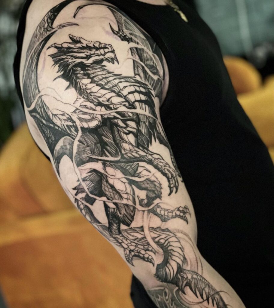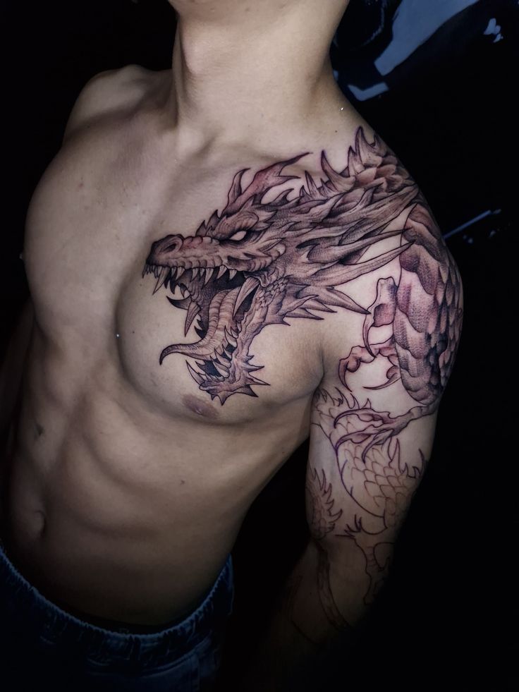 5. Japanese Dragon Shoulder Tattoo – Controlled Chaos