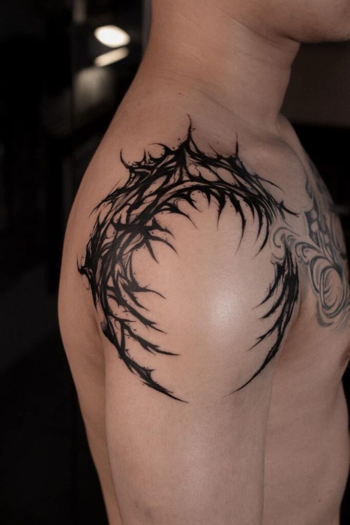 Tribal shoulder tattoos refuse to retire. IMO, they age better than most trends. The flowing lines hug your shoulder naturally, which makes your delts look broader without cheating leg day.