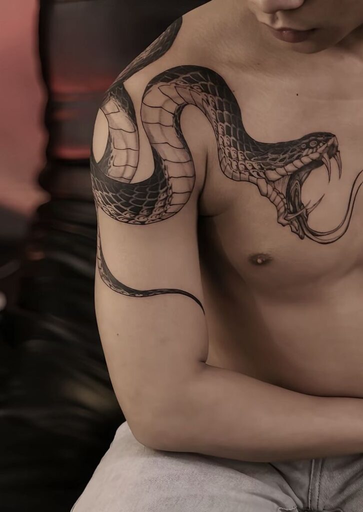 Shoulder tattoos that extend into the arm create flow and visual dominance. This approach works best if you plan long-term ink. A shoulder piece that transitions into a sleeve looks intentional, not random.